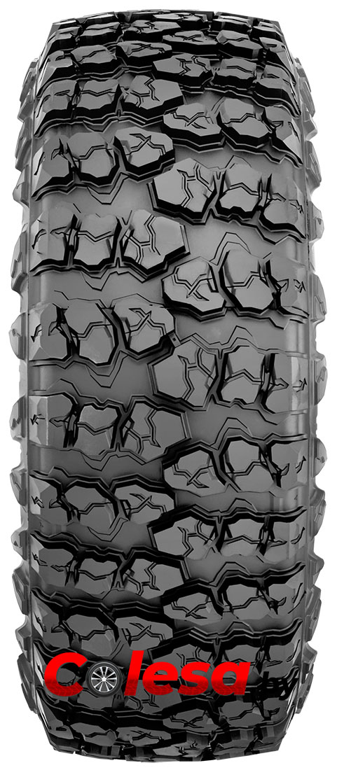 Протектор имеет агрессивный ненаправленный дизайн с мелкими блоками, напоминающими камни, что улучшает стабильность и сцепление. Блоки расположены группами по три, создавая длинные поперечные кромки для усиленного тягового усилия на бездорожье. «Шахматное» расположение этих групп блоков улучшает стабильность сцепления и равномерно распределяет давление автомобиля на дорогу.