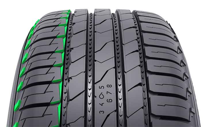 Еще одной технологией, также направленной на повышение устойчивости к аквапланированию, является Trumpet Grooves. Ее суть заключается в особой форме поперечных дренажных канавок, располагающихся в плечевых зонах протектора. Они расширяются по направлению к его центральной части. Данная особенность существенно повышает их пропускную способность, что, в свою очередь, улучшает сцепные свойства на мокрой дороге шины Nokian Hakka Blue SUV.