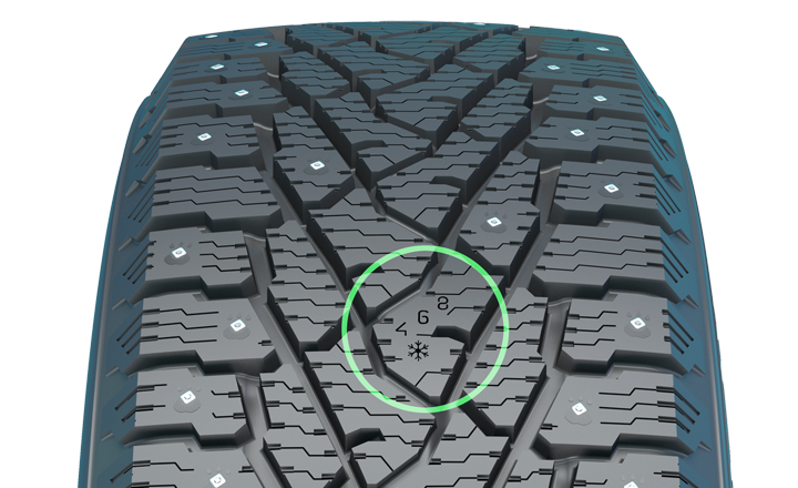 — множество четырехгранных шипов в сочетании с оптимизированной схемой их расположения обеспечивает отличное сцепление на льду в течение всего срока эксплуатации;